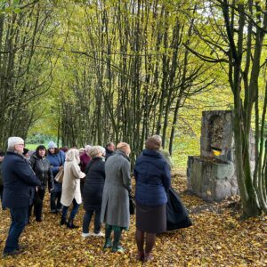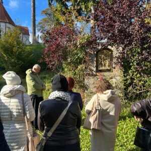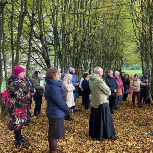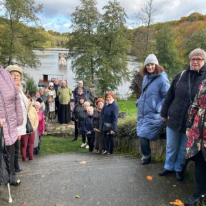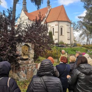 Po nabyciu ,,cegiełek na renowacje świątyni,, w formie miodu z parafialnej pasieki lub magnesu i rozgrzaniu się przy cieplej kawie udaliśmy się na Drogę Krzyżową biegnącą wzdłuż brzegu jeziora, gdzie mogliśmy też zobaczyć wizerunek Matki Bożej Królowej Krajny unoszący się na specjalnej platformie na wodach jeziora. Większość z naszej Wspólnoty nie wiedziała nawet, że niedaleko Tucholi znajduje się sanktuarium Matki Bożej, którego historia sięga XIII wieku, a być może i wcześniejszego czasu, związanego z Cystersami i słynnego z tak wielu udokumentowanych cudów.